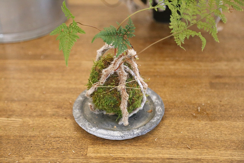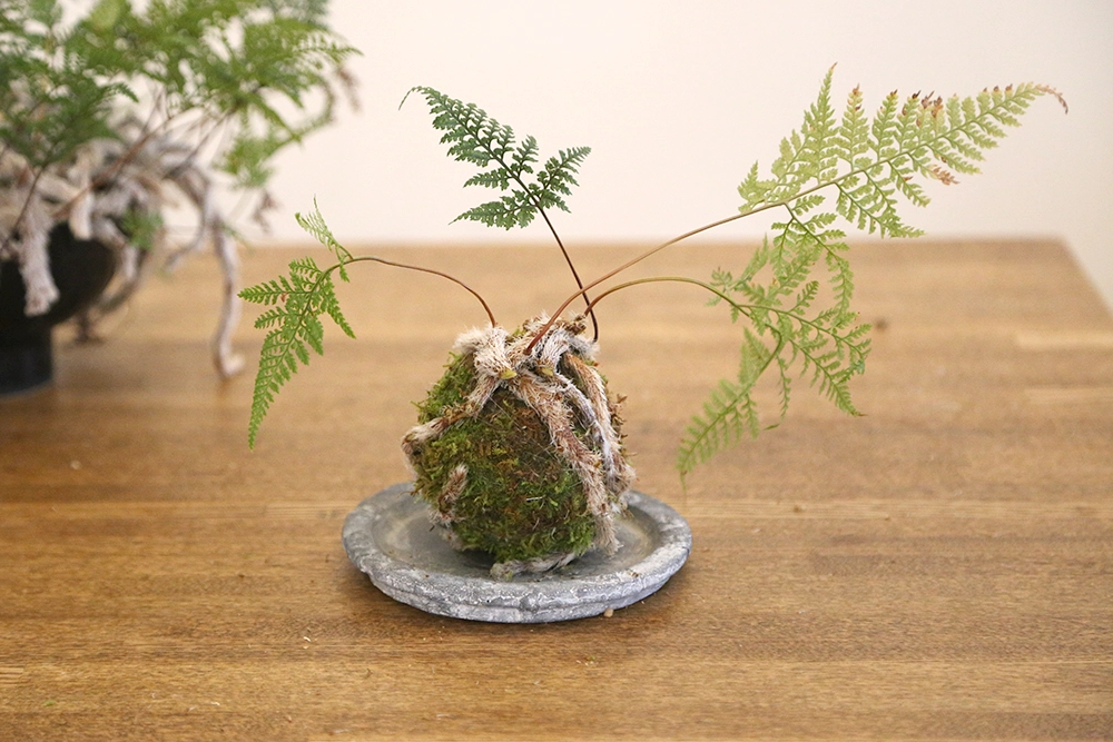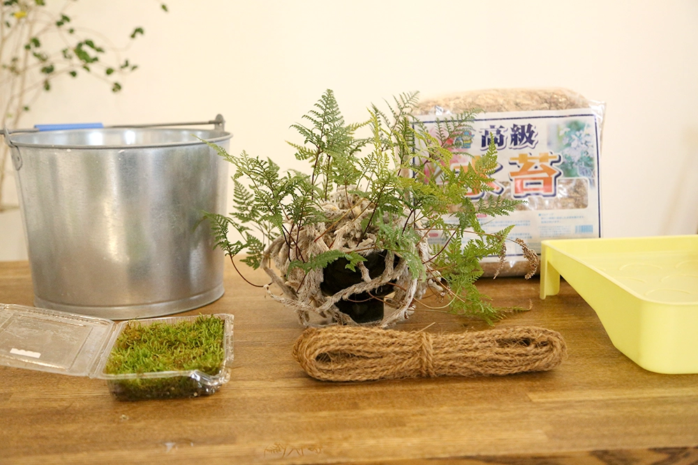 今回表面にはハイゴケを使用しました。ハイゴケは比較的扱いやすく、柔らかいため苔玉に巻きやすいのが特徴です。見た目もやわらかく、トキワシノブの雰囲気とよく合います。