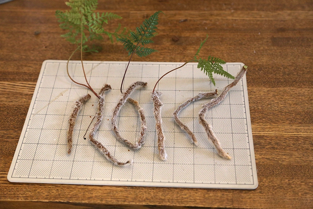 苔玉の土台ができたら、カットした根茎を着生させていきます。
